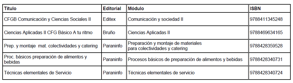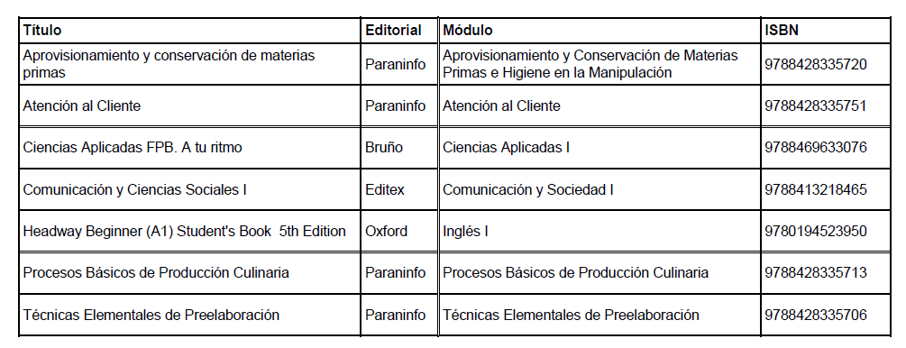 Libros de texto 25/26 FPB COCINA Y RESTAURACIÓN 1º FPB COCINA Y RESTAURACIÓN 2º FPB COCINA Y RESTAURACIÓN