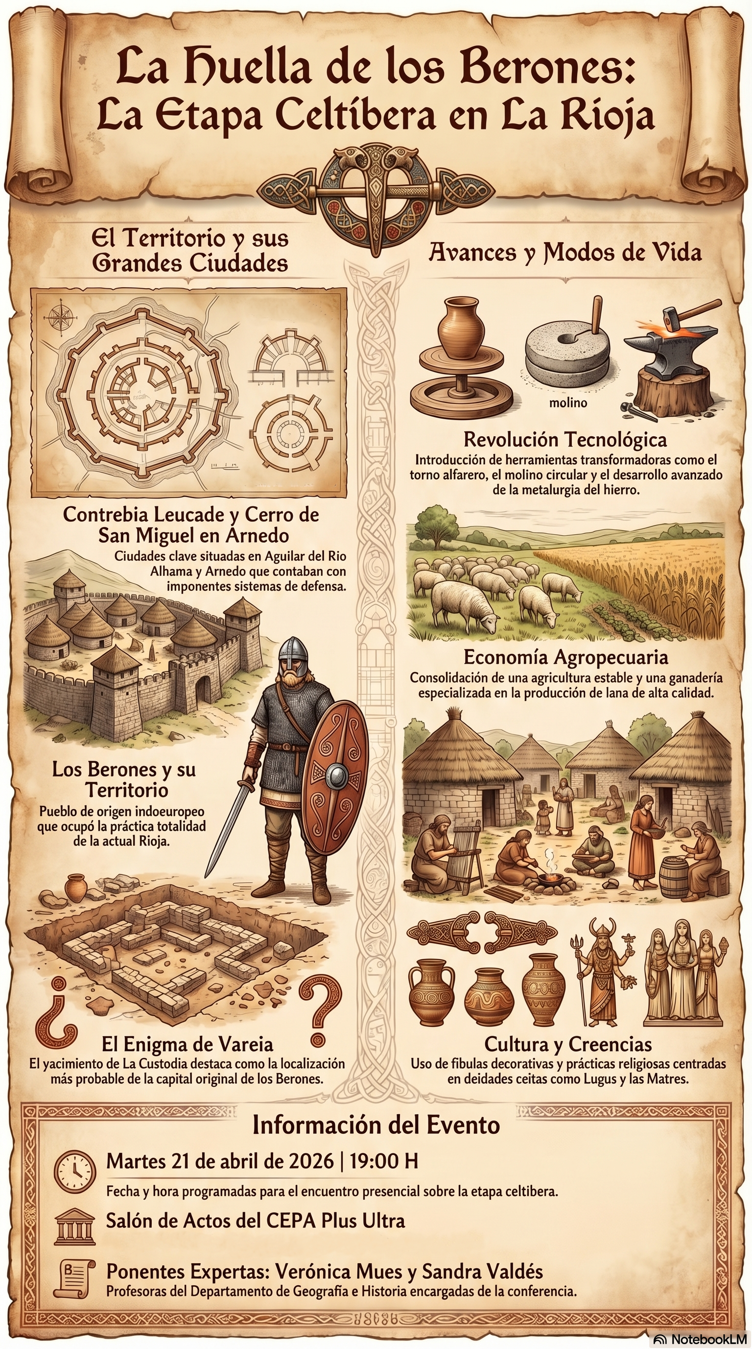 Una charla para acercarse a la historia de los Berones y la etapa celtíbera en La Rioja desde una perspectiva clara y accesible. Tendrá lugar el martes 21 de abril de 2026 a las 19:00 h en el Salón de actos del CEPA Plus Ultra.